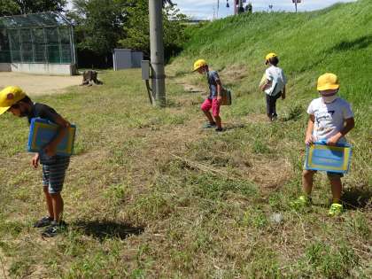 2年生 生き物探し 公開日 2022/09/06 更新日 2022/09/06 2年生 生活科の学習で、学校のまわりにいる生き物を探しにいきました。事前に子供たちが作った生き物の名前を当てはめたビンゴカードをもって、グラウンドや中庭で生き物探しをしました。トンボやバッタなど、この季節ならではの生き物がたくさんいました。楽しみながら学習する姿がたくさん見られました。