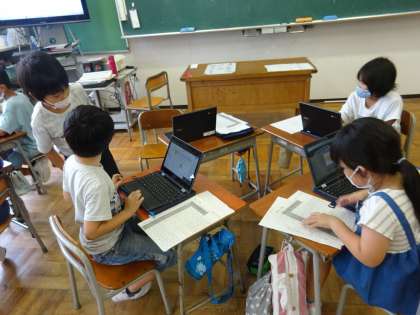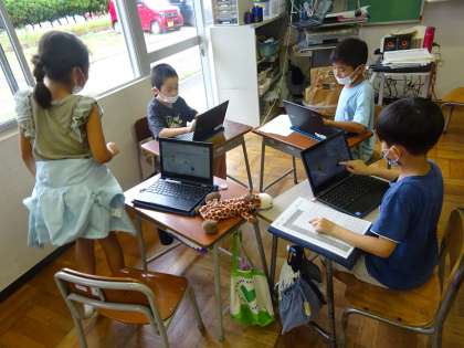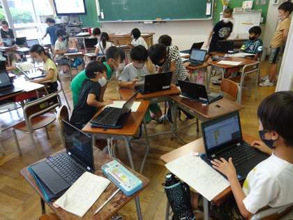 生活科の学習で、学校の周りで見つけた生き物の情報をジャムボードを活用して整理しました。各班、誰がどの生き物について書き込むか役割分担をしたり、ボードに貼り付ける付箋の位置を工夫したりなどして、情報整理をしていました。