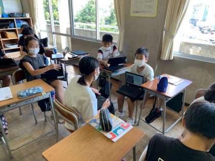 外国語科の時間には、身近な人ができることを紹介し合いました。パソコンのスライド機能を活用して、身近な人ができることや得意なこと伝え合いました。