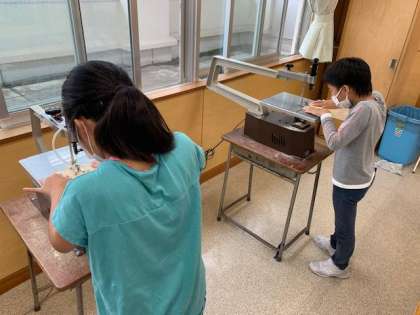 図工の時間に、電動糸のこを使って、木のパズルをつくっています。安全な使い方を意識して、綺麗に切っています。