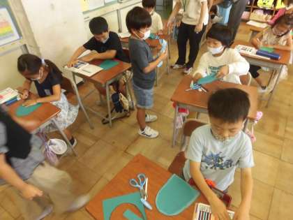 学習発表会の劇に登場する、大きな魚のうろこをみんなで作りました。カラフルな色や個性的な模様のうろこがたくさんできあがりました。世界で1つだけの大きな魚が完成しました。学習発表会では、是非、魚のうろこにも注目してくださいね。