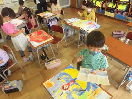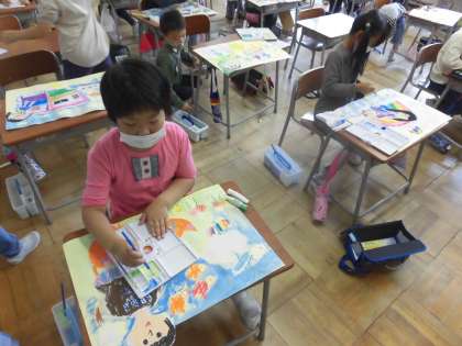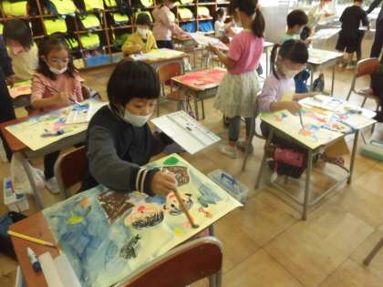 1年生 図工の学習 公開日 2022/10/06 更新日 2022/10/06 1年生 図工の時間には「のってみたいな いきたいな」というテーマで絵を描いています。今日は、背景に水彩絵の具で色を塗りました。自分が思い描くイメージにぴったり合うように色を選んで塗りました。