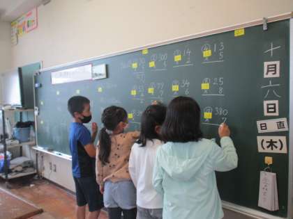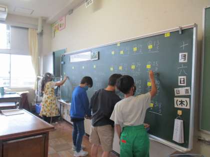 算数では、かけ算の筆算を学習しています。位がずれないように、また、繰り上がりの数に気をつけながら、正確に、速く計算できるようになってきました。今日の学習では、なんと、クラス全員が、みんなの前で筆算をしました!意欲的に学習する姿がすばらしいです。