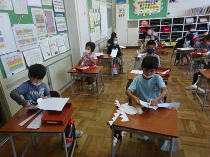 2年生 はさみアート 公開日 2022/10/06 更新日 2022/10/06 2年生 図画工作科の学習で、白い紙をはさみで思いのままにどんどん切っていく活動をしました。ぎざぎざの形やふわふわ形など、いろいろな形が出来上がりました。次回は、切った紙のパーツを使って、画用紙の上に並べて、作品を作って行きます。どんな作品ができるか、楽しみですね。