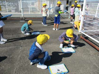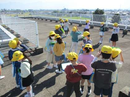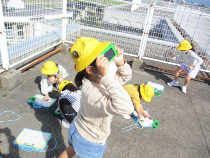 今日は、屋上で太陽とかげの動きを観察しました。方位磁針で方位を、遮光プレートで太陽の位置を確認していました。遮光プレートを通してみると、太陽が緑色に見えることに、子供たちは驚いていました。正しく用具を扱いながら、ていねいに観察することができました。