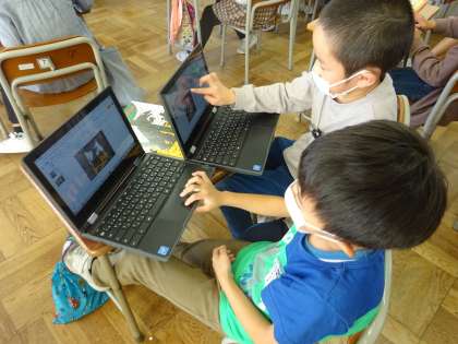 2年生 スライドで絵本の紹介カードづくり 公開日 2022/10/15 更新日 2022/10/15 2年生 Googleスライドを使って、絵本の紹介カードづくりをしました。。ICT支援員さんと一緒に、絵本の表紙の写真をスライドに貼り付けたり、切り取ったりする作業をしました。初めての作業でしたが、あっという間にできるようになった子供達。これから少しずつスライドでまとめることに挑戦していきたいと思います。