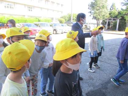 先日の総合の学習では、自治振興会長の杉森さんをお招きし、神明地区について教えていただきました。神明地区で行われている米作りのことや、井田川の洪水のことについて語っていただきました。