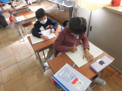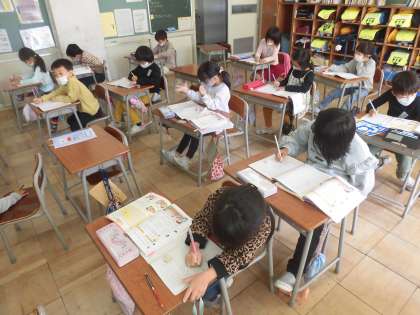 算数では9+4などの繰り上がりのある足し算の勉強をしています。計算の仕方を説明できるように、ブロックを操作しながら練習を重ねました。今では、計算の方法が分かり、ノートに式を書いて、自分でどんどん進めることができるようになっています。写真は、練習問題をしているようすです。とても集中して取り組んでいました。