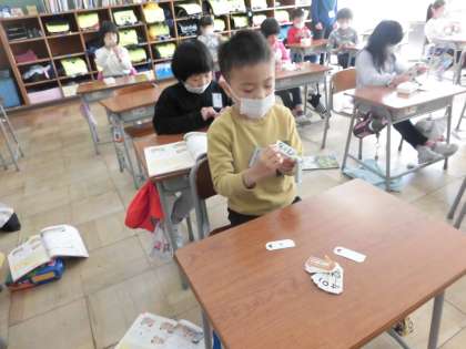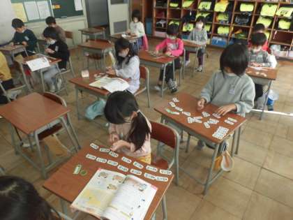 繰り上がりのある足し算の計算を、数カードを使って練習しました。宿題でも繰り返し練習をしていきます。
