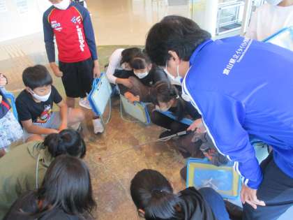イタイイタイ病資料館では、実際に神明地区でも起きた過去の公害の被害を、映像や資料を通して学びました。事前に学習してきたこともあり、子供たちは真剣に話を聞いたり、映像に見入ったりしていました。