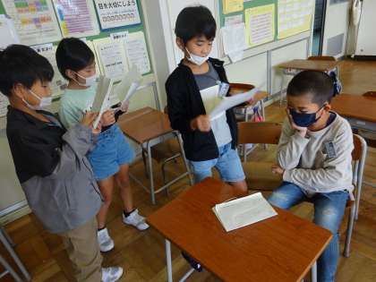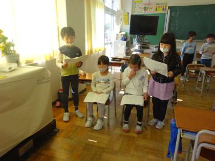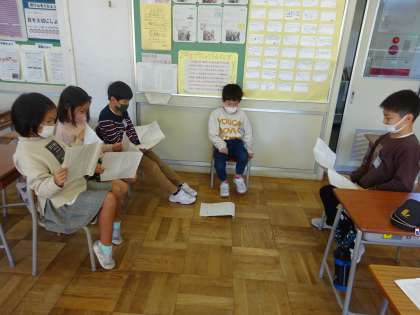 2年生 音読劇発表会に向けて 公開日 2022/10/26 更新日 2022/10/26 2年生 国語科の学習で、お手紙の音読劇の練習をしています。登場人物の気持ちに合った動きを考え、動きを取り入れながら音読をしました。各班で話し合って決めた動きを取り入れ、楽しんで音読劇をしています。音読劇の発表会が楽しみです。