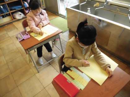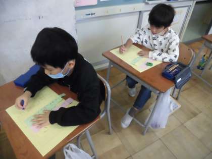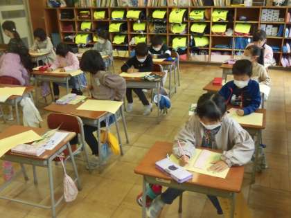 1年生 国語科「しらせたいな、見せたいな」 公開日 2022/11/02 更新日 2022/11/02 1年生 うさきちのことが詳しく分かる文を書いています。うさきちを見ながら書いたメモをもとに、順序を考えながら書きました。今日は、清書もしたので、おうちの人に伝える準備はばっちりです。