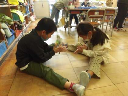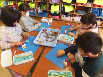 1年生 生活科「秋をなかよし」 公開日 2022/11/02 更新日 2022/11/02 1年生 先日の秋見つけで、たくさん集めたドングリを使って「ドングリごま」を作りました。よく回るには、どうしたらよいか考えながら作りました。友達と一緒に回したり、回る時間を競い合ったりして、楽しみました。