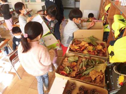 木の実や落ち葉を使っておもちゃ作りをしています。自分で集めた材料を使って、教科書や動画を見ながら作りました。そして、作ったおもちゃで楽しく遊びました。
