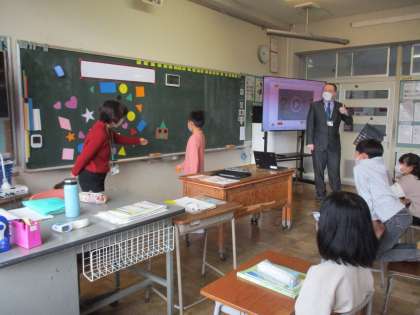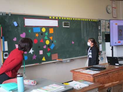 外国語活動では、「色」と「形」の二つの単語を伝える活動をしています。この日は、形を組み合わせて家や動物を表しました。いろいろな組み合わせができましたね。