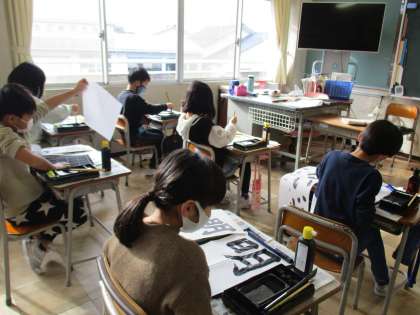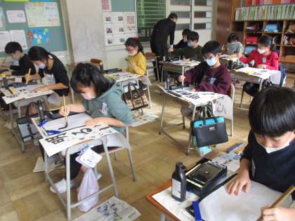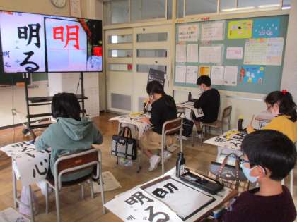 今年の3年生は「明るい心」と毛筆で書きます。明るい心で新しい年を迎えるためにも、今日はそれぞれの文字を半紙で練習しました。手本と見比べながら、丁寧に書いていました。書初大会に向けて、これから練習していきましょう。
