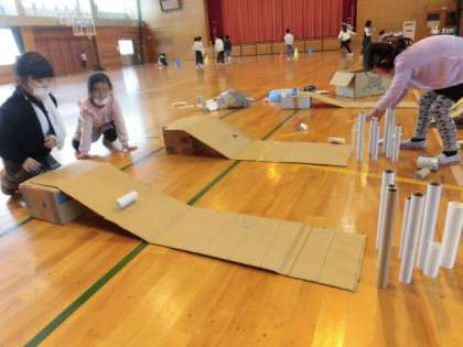 生活科の学習で、2年生が作ったおもちゃを1年生に遊んでもらうおもちゃフェスティバルに向けて、準備をしています。おもちゃ作りだけでなく、どんなルールにすると分かりやすいか、目印になる線をどこに引いたらよいかなど、各グループで話し合いながら、意欲的に活動しています。