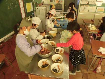 3学期もおいしい給食が始まりました。2年生に向けて、自分たちでできることを考え、声を掛け合って準備や片付けができるように支援しています。今日も、並べる順番を自分たちで考えながら準備していました。