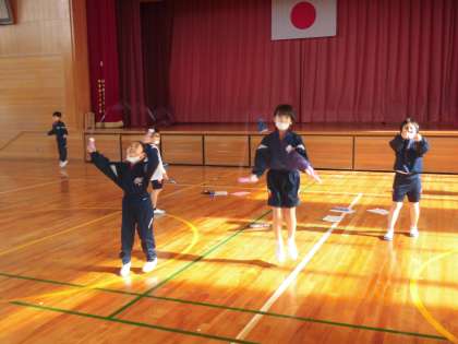 「なわとびがんばりカード」を活用しながら、跳べる回数や技を増やせるように練習をしています。帰りの会の振り返りでは、縄跳びで、できるようになった技や友達の頑張りについて話す子供がたくさんいました。続けて、取り組んでいきます。