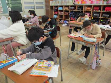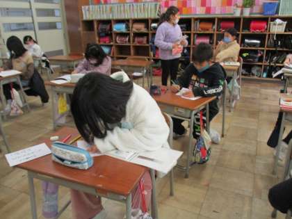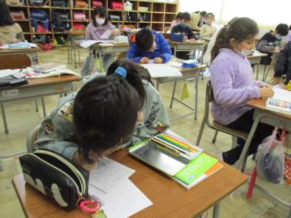 今日は、これまで習った漢字の音読みと訓読みの両方をつかったかるたを作りました。言葉に合わせて取り札の絵も描きました。すてきな作品がたくさんできましたね。