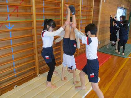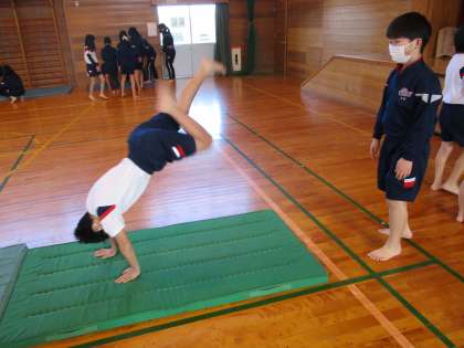 4年生は、体育科でマット運動に取り組んでいます。3年生の時に取り組んでいたこともあり、自信をもって自分の選んだ動きに挑戦していました。最後には「前転・後転・倒立」を組み合わせた発表をするので、みんな張り切って練習しています。