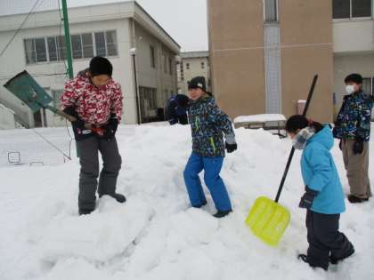 今日は天気も良さそうだったので、全員でグラウンドに出て雪遊びをしました。下学年が遊べるように、雪の滑り台や大きな雪山をつくろうと頑張っていました。