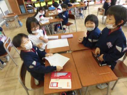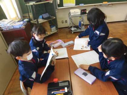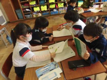 1年生 国語科「ことばを見つけよう」 公開日 2023/02/04 更新日 2023/02/04 1年生 グループに分かれて、「いきもの」が隠れている言葉と「もの」が隠れてる言葉を集めました。いろいろな教科書の中にある言葉や教室の掲示のからもたくさん探すことができました。次の時間に、集めた言葉を使ってクイズを作ります。