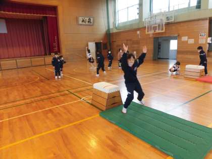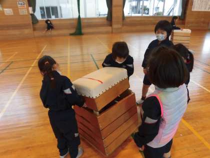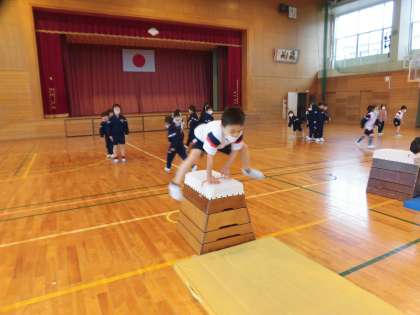 1年生 体育科「跳び箱あそび」 公開日 2023/02/12 更新日 2023/02/12 1年生 跳び箱遊びをしています。まずは、準備や片付けの仕方を学びました。みんなで力を合わせて安全に運ぶことができました。