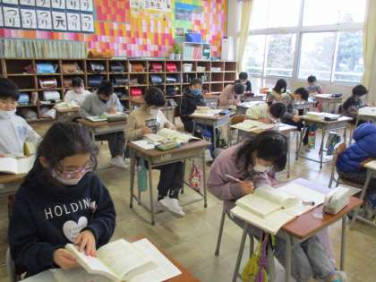 国語の学習では、相手により伝わりやすい文章の書き方を学習しています。この日は、言葉の語彙を増やすために、「言葉のたからばこ」にある言葉で、意味を詳しく知りたい言葉を辞典を使って調べました。1学期に使い方を学習しましたが、辞典を繰る速さがどんどん速くなっています。様々な言葉を知って、より豊かな表現ができるといいですね。