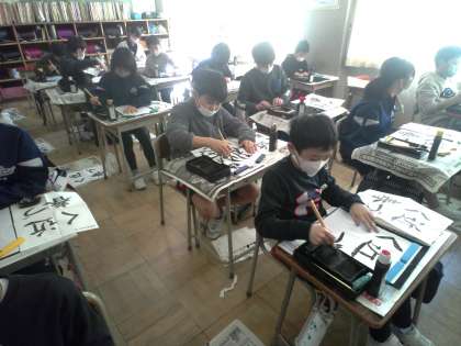 書写の時間には、最後の課題である「近づく春」に挑戦しています。1年間の学びを生かして、丁寧に集中して書いています。