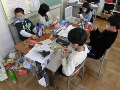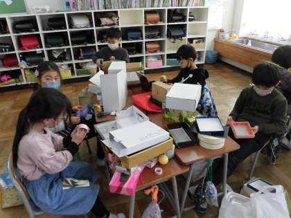 今日は、図工の学習にいろんなはこを使って小さな家づくりをしました。