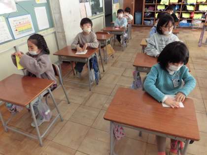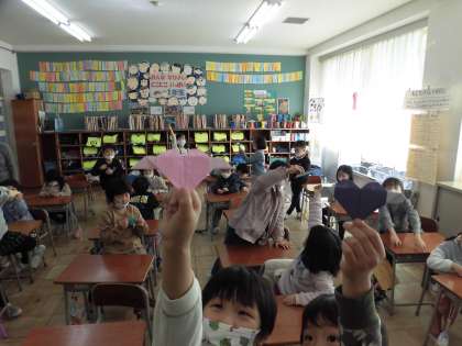 1年生 おりがみ係のミニ先生 公開日 2023/03/01 更新日 2023/03/01 1年生 図画工作の時間におりがみをしました。学級のおりがみ係の人が、ハートの折り方を発表しました。カメラに写しながら折り方を説明してくれたので、みんなで折ることができました。できたがったハートに模様や顔を描いて楽しみました。