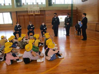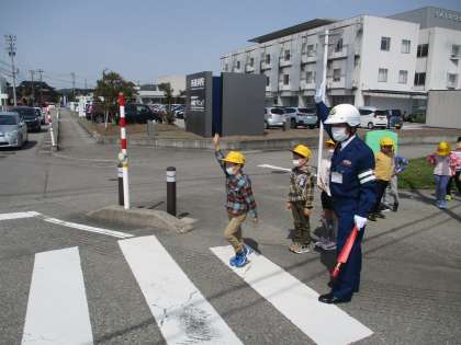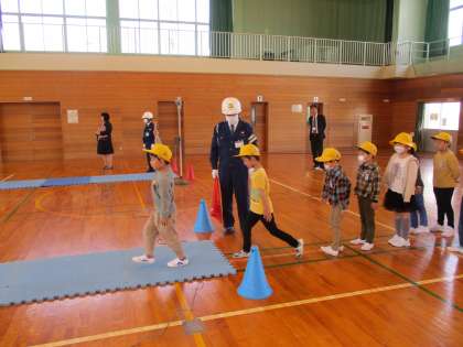 富山西警察署、五福交番、神明地区交通指導員の皆様のご協力を得ながら、交通安全教室を開きました。警察官の方から、横断歩道を渡る際の注意点を聞いた後に、体育館の模擬交差点や、県道の交差点を実際に歩いて練習しました。しっかりと左右を確認してから、安全に渡れるようになりました。ご協力いただいた方々、ありがとうございました。