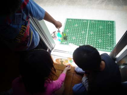 図工でひかりを通して楽しむうちわを作りました。太陽の光にあてて、映る様子を楽しみながら、形に合わせてさまざまな色を付け加え、作品を完成させました。出来た作品を鑑賞して、友達の作品の良いところを伝え合いました。