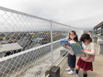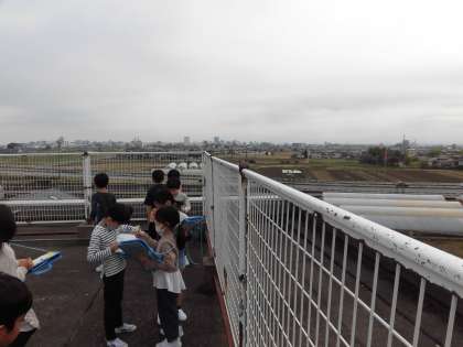 3年生 社会科「学校のまわりのようす」 公開日 2023/04/20 更新日 2023/04/20 3年生 屋上へ行き、神明小学校の周りにはどんなものがあるのか調べました。建物の他にも、山や川が多くあることが分かりました。