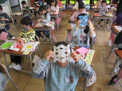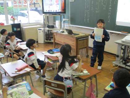国語科「こんなものみつけたよ」で学校の中で見付けたものを紹介しています。図画工作科「ちょきちょきかざり」では、折ったり重ねたりした色紙を切っておもしろい形を楽しんでいます。体育科では、かけっこにも慣れてきて、リレーに挑戦しています。