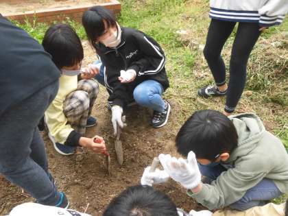 理科の時間に、ジャガイモの種いもを植えました。団のみんなで協力して、肥料を混ぜたり、種芋に石灰を付けたりしました。大きなジャガイモが育つとよいですね。