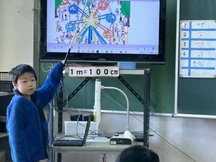 迷子のお知らせを聞いて、教科書の図の中から迷子を見つけました。大事なことを落とさずに聞き、メモをとる学習をしています。子供たちはアナウンスを注意深く聞き、真剣にメモを取って、見つけた人物を自信をもって発表しています。