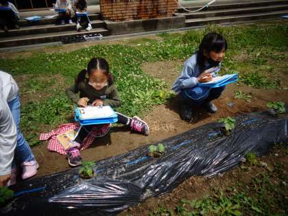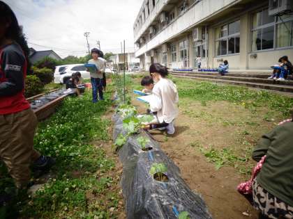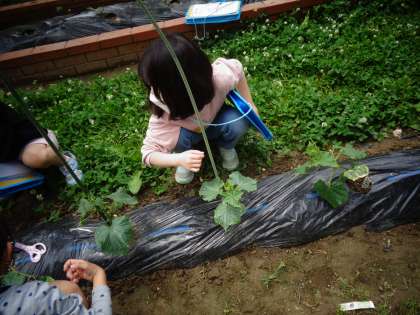 野菜苗を植えて育て始めてから、約2週間が経とうとしています。キュウリの細いつるが巻き付くものを探して伸びてきている様子を見て、子供たちは支柱を建てました。トマトは、そろそろ花が咲いて小さい青い実ができているのを見つけて、子供たちは喜んで絵日記に記録しています。