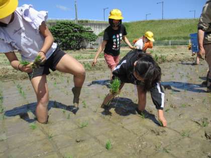 今日は神明おのがわ農園さんの協力のもと、田植え体験をさせていただきました。最初は田んぼに入ると「きゃー、歩きにくいー」「先生、動けなくなりました〜」などの声が多数ありましたが、徐々に慣れていき、みんなで500平方メートルの田んぼに苗を植えることができました。貴重な体験をすることができましたね!!