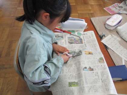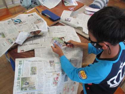国語科「アップとルーズで伝えよう」では、新聞からアップやルーズで撮られている写真を見つけました。写真を見て何を分かりやすく伝えているのかを考えました。