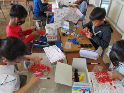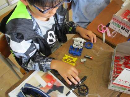 理科「電流のはたらき」では、教材キットを使って学びます。子供たちは目を輝かせながら、プラグに導線を巻き付けたり、モーターを動かしたりしていました。