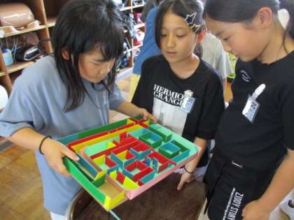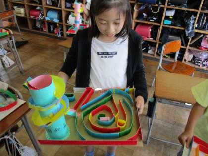 図画工作科で作ったコロコロガーレで遊びながら、鑑賞会をしました。複雑な迷路になってたり、テーマを持ったコースになっていたりして、遊びから友達の工夫を見つけていました。