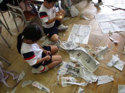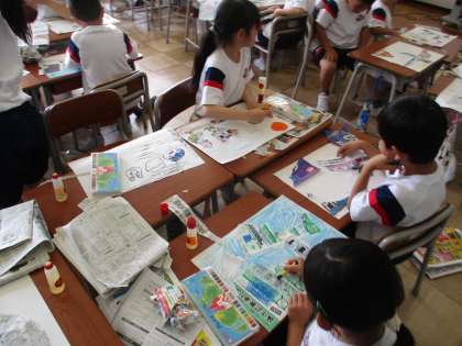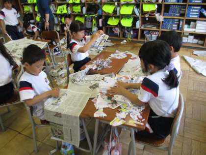 1年生は図画工作科で「やぶいた かたちから うまれたよ」という学習をしています。新聞やチラシなどの紙を手で破き、いろいろな物に見立てる学習です。人によって違う物に見えることを楽しみながら作っています。