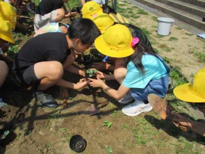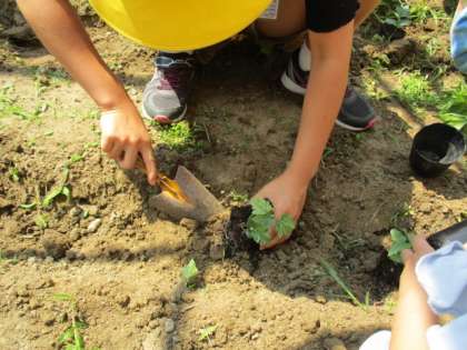 理科の学習で育てているヘチマの苗を畑に植えかえました。畑でもすくすくと育っていってほしいです。