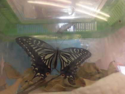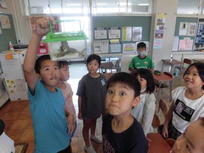 3年生 アゲハチョウとお別れ 公開日 2023/06/14 更新日 2023/06/14 3年生 理科の学習でチョウの成長について学習をしたとき、家の庭の柚の木にいたアゲハチョウの幼虫を持ってきてくれた人がいました。今日、ついに成虫になり、みんで観察をしました。モンシロチョウと比べて体が大きいことに子供達は驚いていました。最後に、恒例になっているお見送りをしながら自然に返しました。