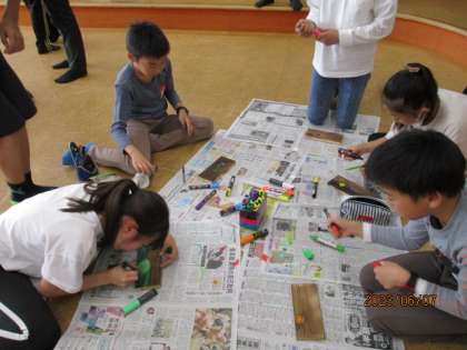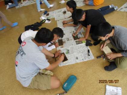 焼き板を作りました。木の板をガスバーナーで焼き、綺麗に磨いた面に、様々な絵を描いました。立山の自然を描く子供や夜空を描く子供等、思い出に残る作品を作っていました。