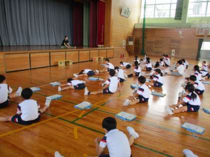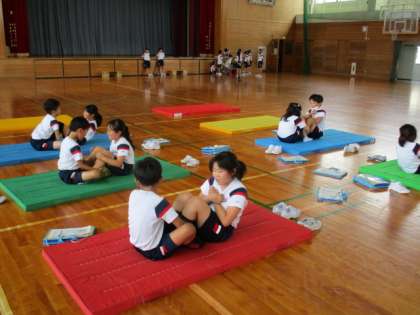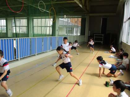 3年生と一緒に体力テストを行い、長座体前屈や上体起こし、立ち幅跳び、反復横跳びの4種目をしました。どの種目でもいい記録を出そうとがんばっていました。