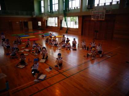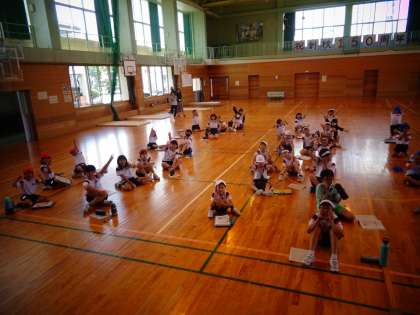 2年生・5年生合同で、体力テストの反復横跳び、長座体前屈、上体起こし、立ち幅跳びを行いました。2年生は5年生の測定の様子を見て、こつを掴んでいる子供もいました。写真は、無事測定が終わって、ほっとしている子供たちの様子です。