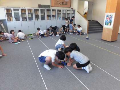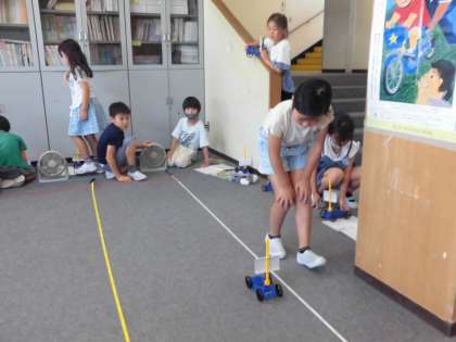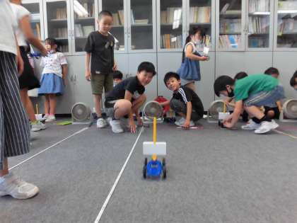 3年生 理科「風の力」 公開日 2023/06/20 更新日 2023/06/20 3年生 理科の時間に風の力で車を動かす実験をしました。風の強さによって車の進む距離が違うのかを確かめました。算数で巻き尺の使い方も学習したので、距離を測るのもスムーズでした。